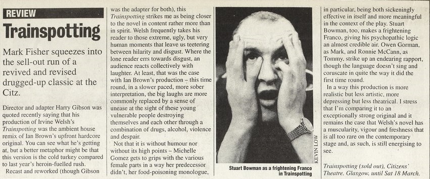 Article from the Lennox Herald, 2 August 1996, which makes clear that Trainspotting continued to tour the UK concurrently with its run at the Whitehall Theatre on London's West End.